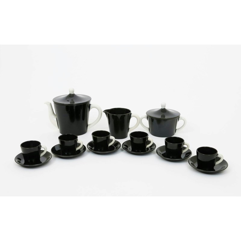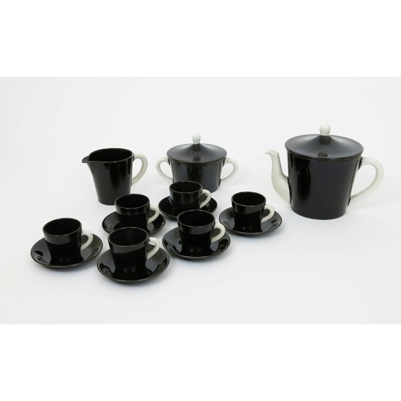A Richard Ginori coffee set for six designed by Gio Ponti, model no.5030, glazed black and white, comprising; coffee pot and cover, milk-jug, sugar basin and cover and six small cups and saucers printed Richard Ginori mark, 28-9-35, painted 5030, 17cm. high (9)