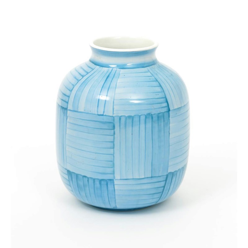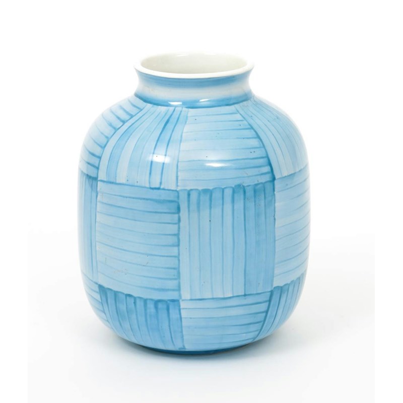 A Richard Ginori vase the design attributed to Gio Ponti, shouldered cylindrical form, painted with a patchwork design in shades of blue printed Richard Ginori mark, painted 5002/3427, fine hairline to inside of top rim, 23cm. high