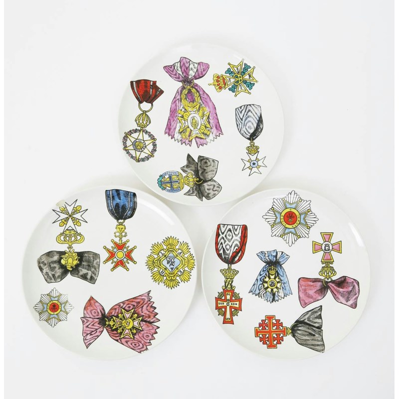 Al Merito three Fornasetti plates designed by Piero Fornasetti, each printed in colours with medals, printed factory marks, numbers 3,4,5, chip to rim of one, 26cm. diam.