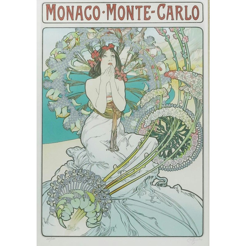 'Monaco - Monte Carlo' a modern lithographic printed poster after a design by Alphonse Mucha, authorised by Jiri Mucha, framed, signed in pencil and numbered 230/350,, 57 x 39cm (image)