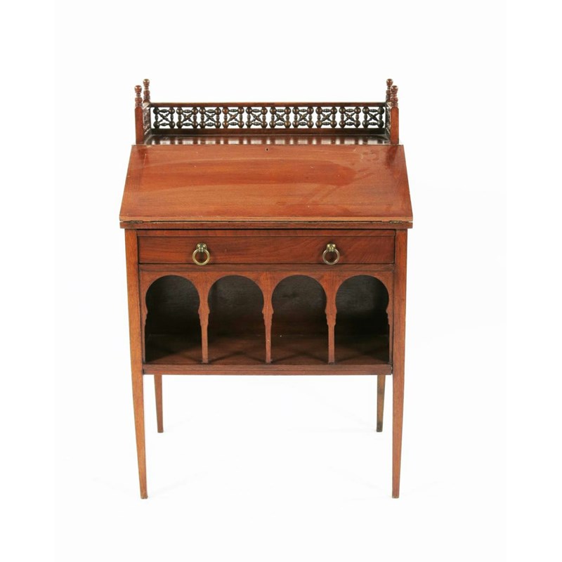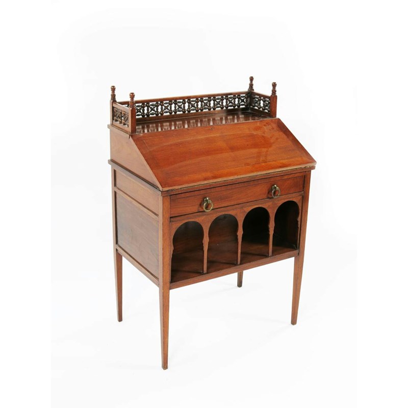 A Liberty & Co Anglo Moorish bureau, with arched substructure and mashrabiya panel gallery applied paper label 62cm. wide, 93cm. high