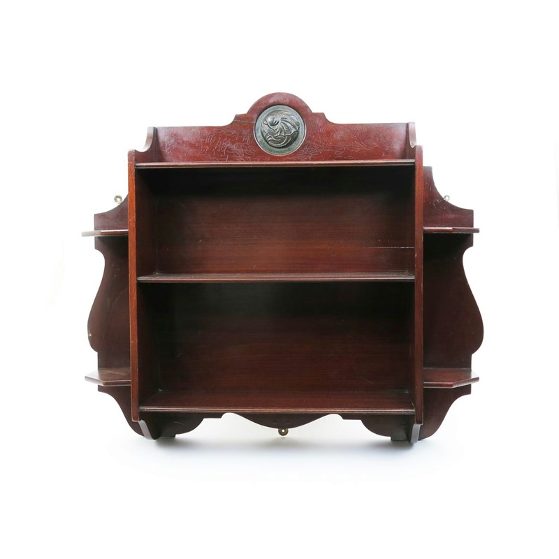 An Arts and Crafts mahogany wall-mounted display shelf possibly Shapland & Petter, the back inset with patinated metal fish roundel, stamped R930, 127 to back, , 67cm. high, 76cm wide