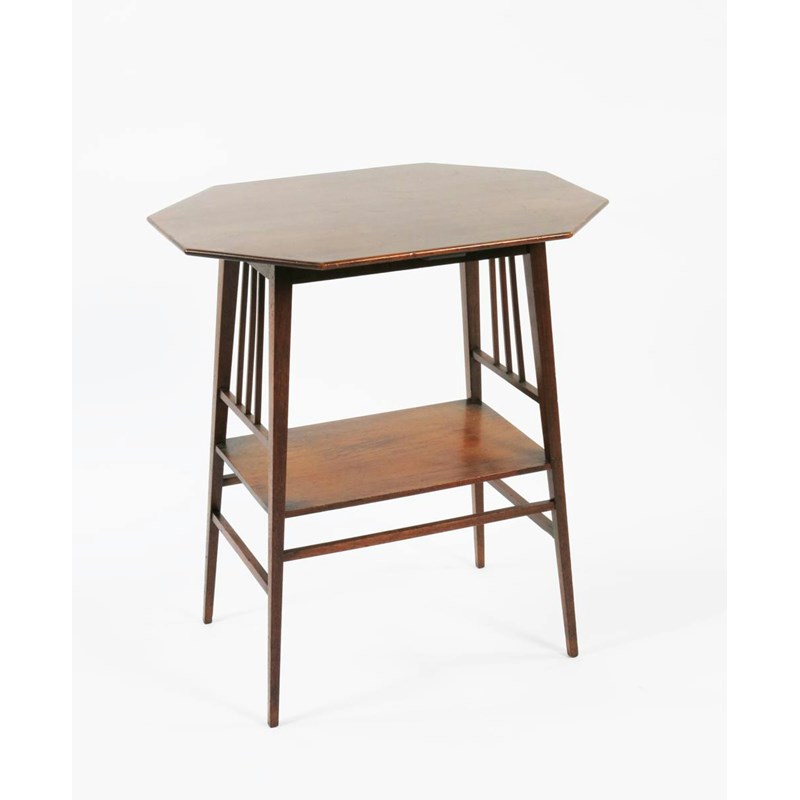 A James Shoolbred mahogany occasional table, possibly designed by H.W. Batley, model 9105, octagonal top over flaring legs and rectangular shelf stamped number 61 x 45cm top, 67cm high