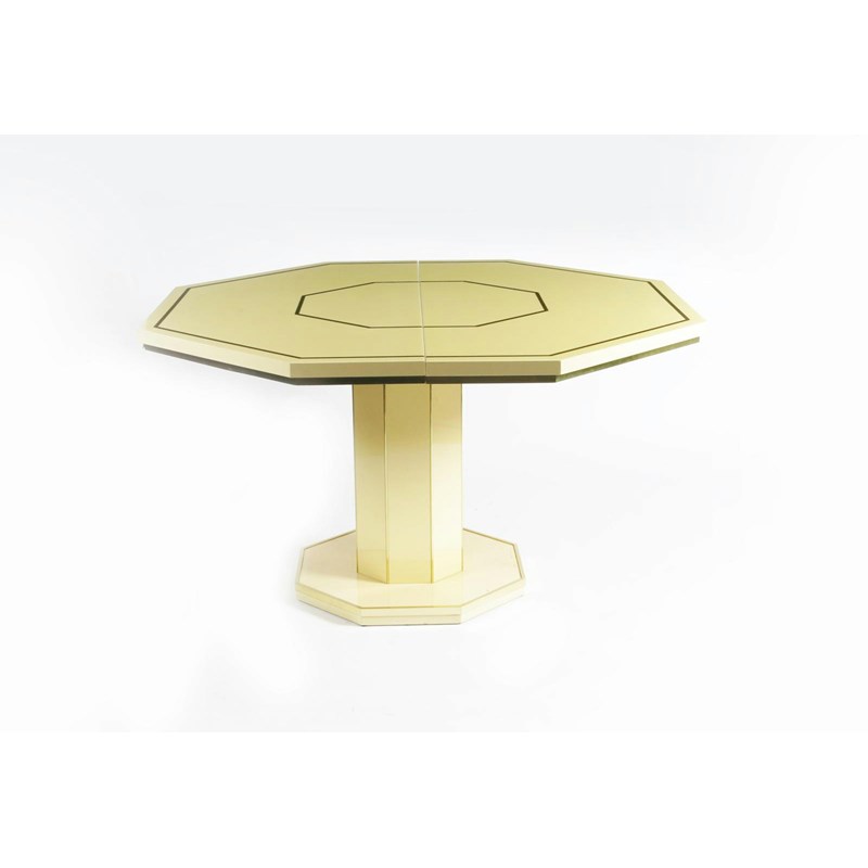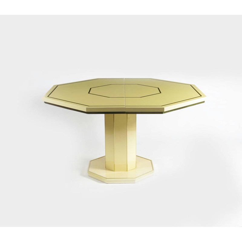 A Paco Rabanne cream lacquered dining table, the faceted central pedestal supporting octagonal top with single extension leaf, remains of signature Paco Rabanne to side to top, 130cm. wide.