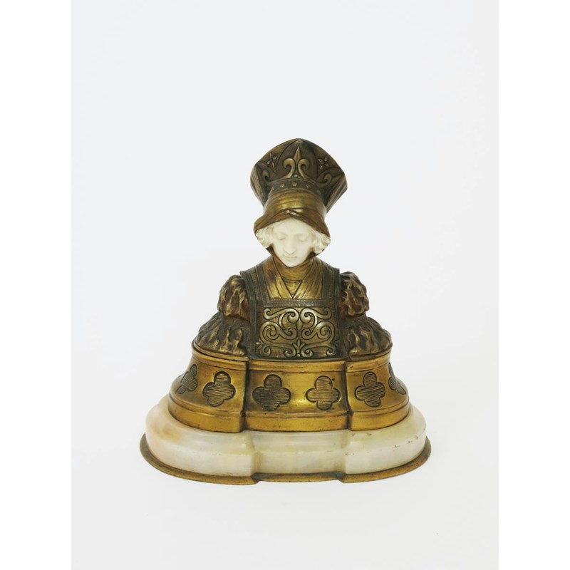 λ A gilt bronze and ivory figural casket cast from a model by Dominique Alonzo, modelled as a Renaissance lady, hinged at the plinth, on alabaster base stamped marks, 18cm. high