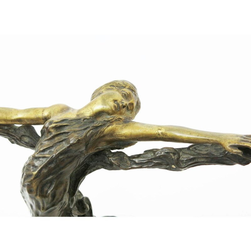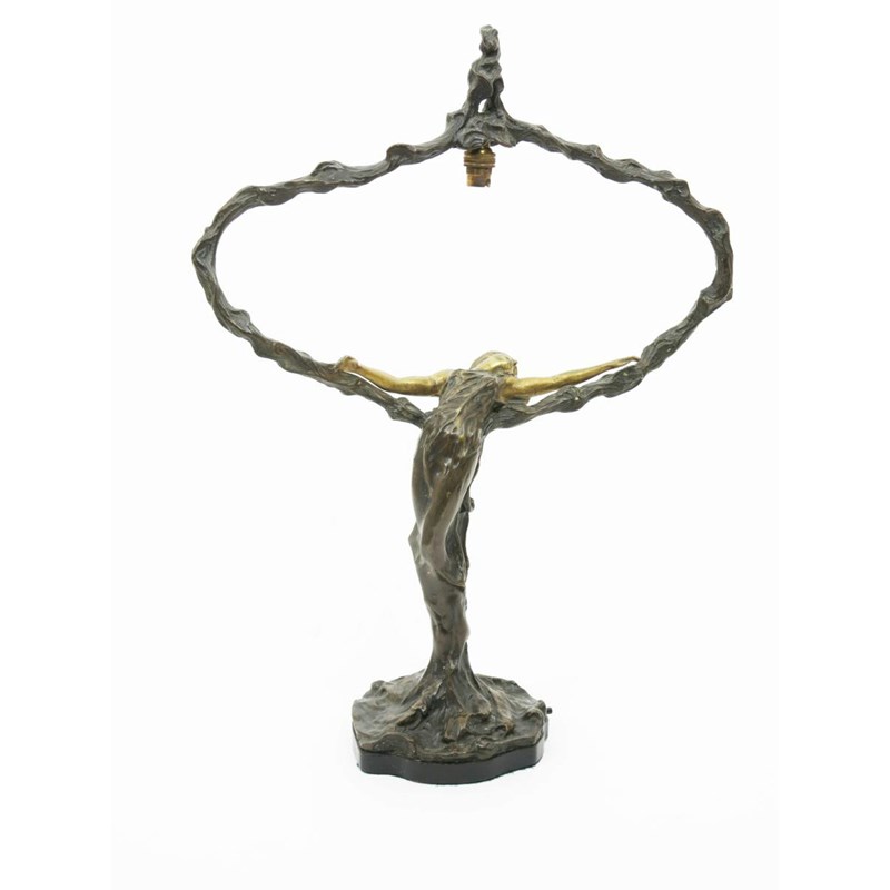 An Art Nouveau patinated bronze figural lamp base cast from a model by M Meliodon, modelled as a female figure, back arched and arms outstretched, on ebonised wood base signed in the cast, 54cm. high