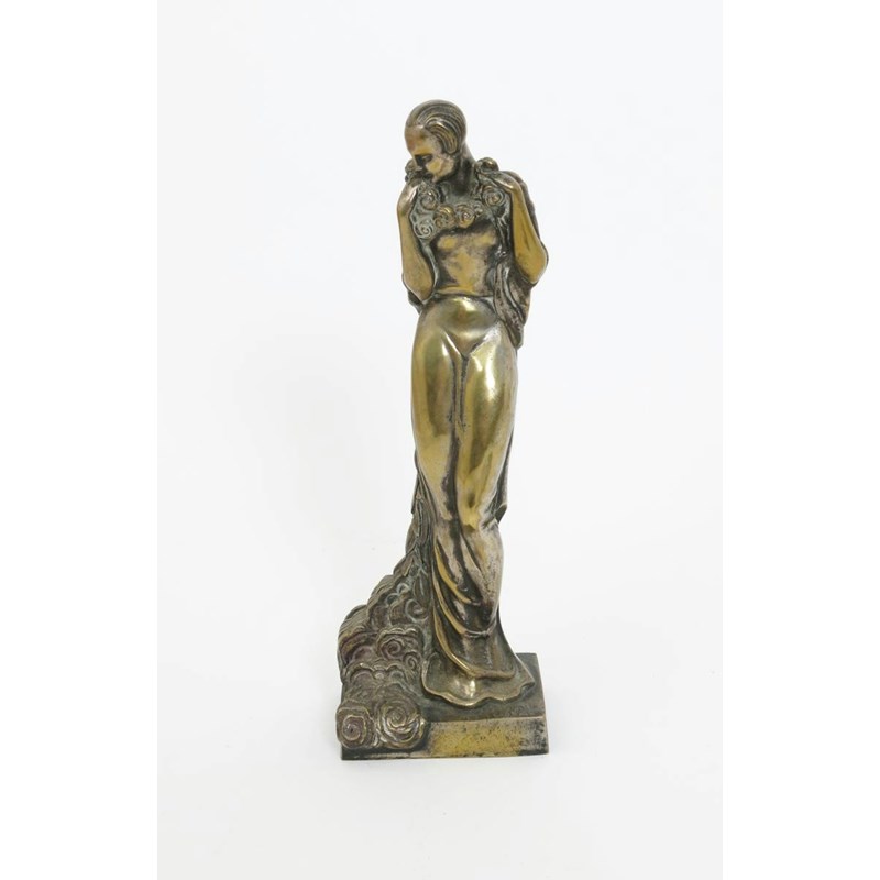 A silvered bronze model of a woman holding a garland of flowers cast from a model by Helene Grunne
