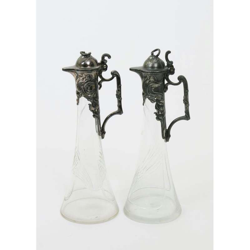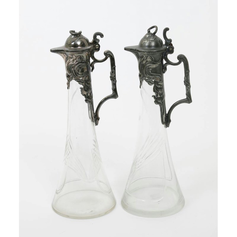 A pair of W.M.F pewter and glass decanters, with hinged covers, the cast with flowers, the glass body with cut foliate design stamped marks, 26cm. high