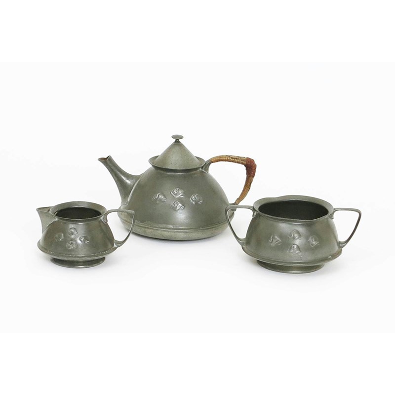 A Liberty & Co Tudric Pewter three piece tea set, model no.0303, cast in low relief with a stylised foliate panel, comprising teapot and cover, milk-jug and sugar basin stamped marks, 12.5cm. high