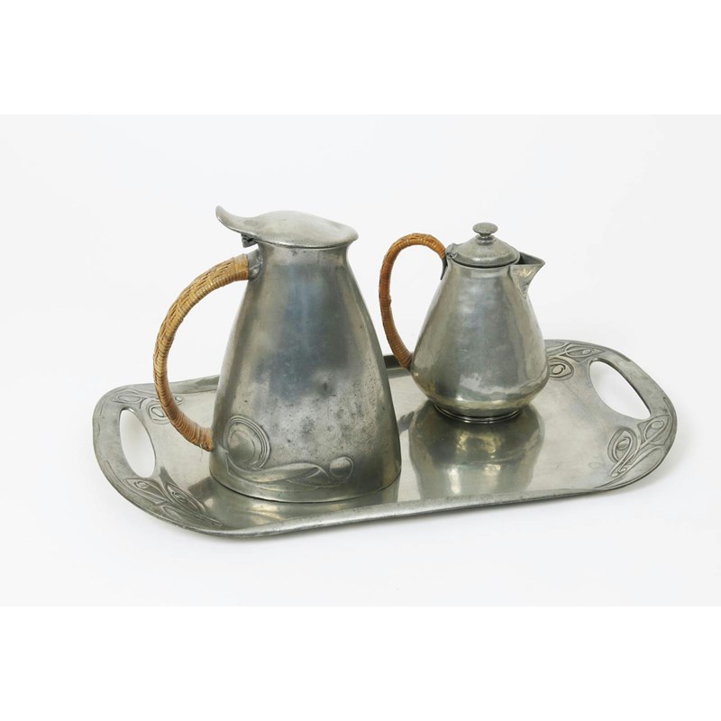 A Liberty & Co Tudric Pewter jug designed by Archibald Knox, cast in low relief with Art Nouveau whiplash design, a Liberty tray designed by Archibald Knox and a four piece pewter teaset stamped marks, 20cm. high
