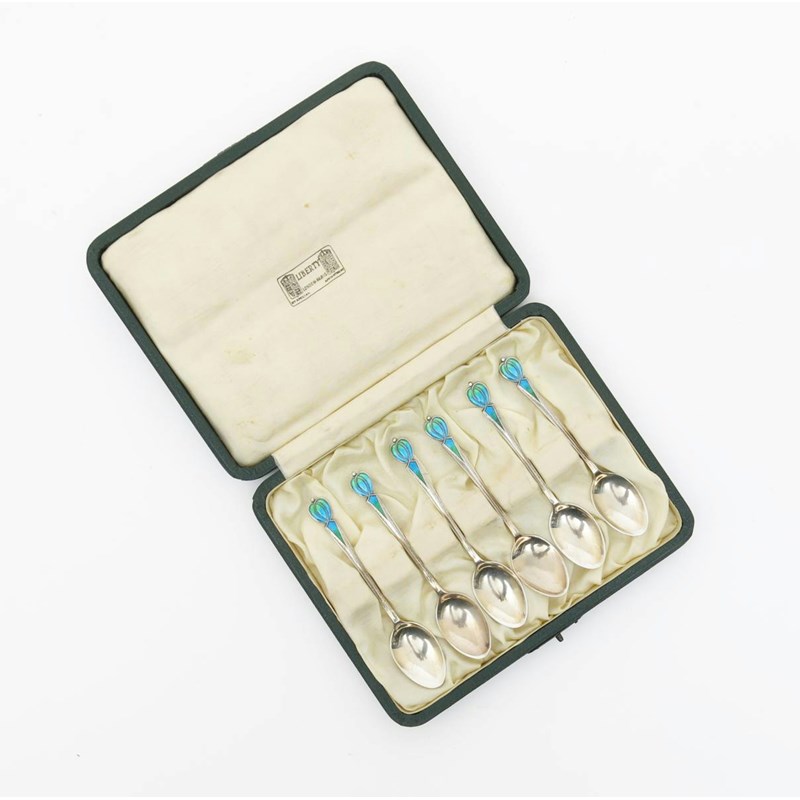 A set of six Liberty & Co silver and enamel spoons the design attributed to Archibald Knox