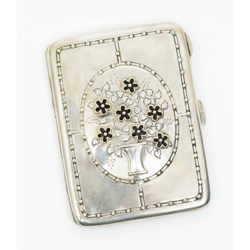 A William H Haseler silver and enamel card case, rectangular, hinged form, cast in and stamped in low relief with a vase of flowers, enamelled black petals, stamped marks, WHH Birmingham 1924, 8.5 x 6.5cm.