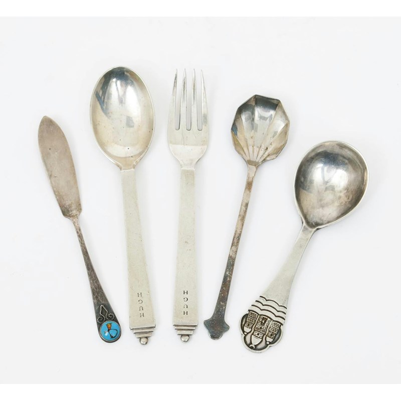 A Georg Jensen silver christening spoon and fork, the flaring stems stamped Hugh, a Bernard Instone silver butter knife with turquoise enamel roundel and two other silver spoons stamped marks 14cm long