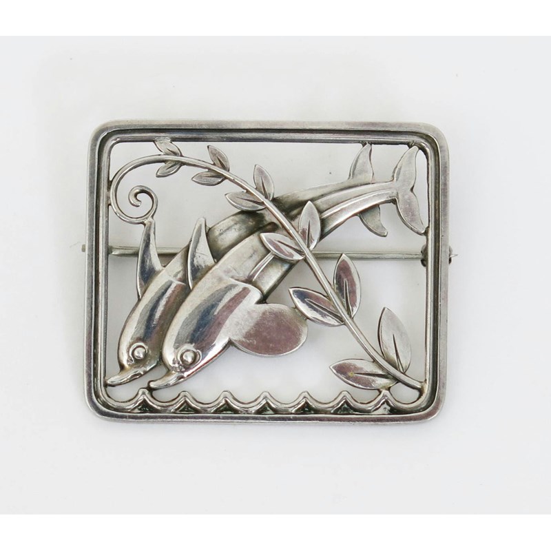 A Georg Jensen silver brooch, model no.251, pierced rectangular form cast with twin leaping dolphins stamped marks, 4cm. wide