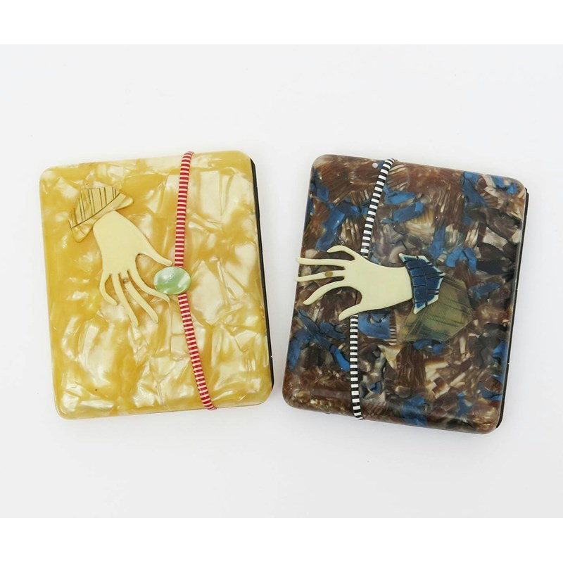 Two French hand-clasp celluloid cigarette cases, one marbled cream, with yellow sleeved ivorine hand holding a green pebble forming the clasp, the other in a deep chocolate and blue marble, the blue checked sleeve hand curving over the edge as the clasp stamped Foreign,