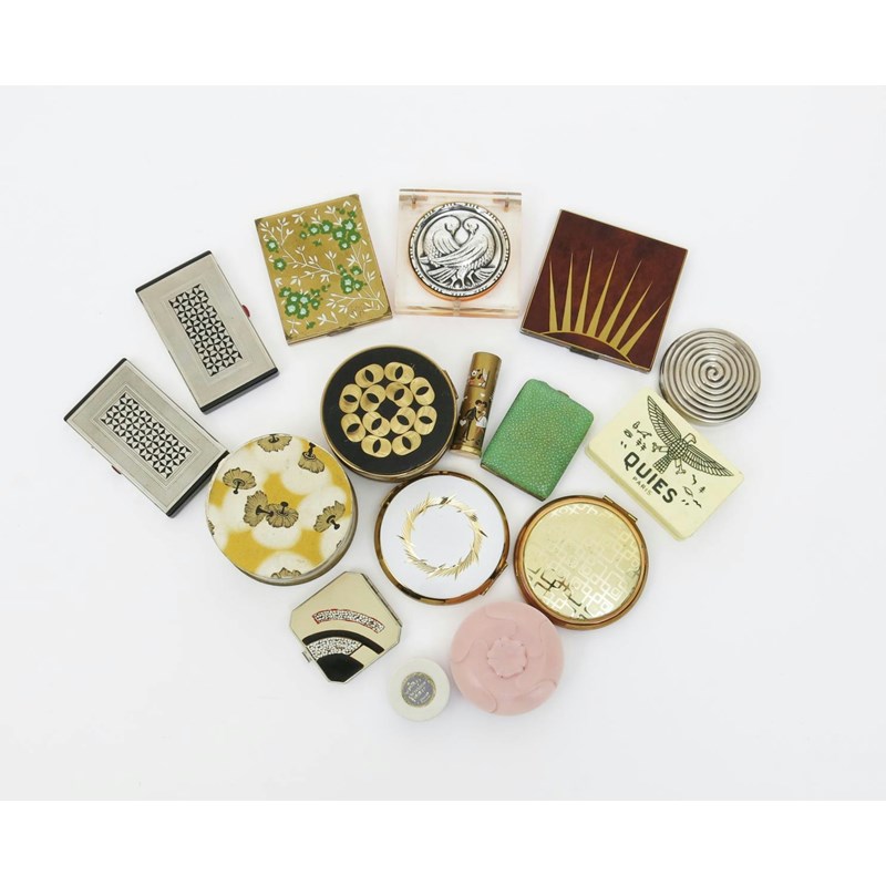 A Dhassy Brevete enamelled metal compact, canted square section, the hinged cover enamelled with geometric design set with egg shell, a Coty Powder box and cover designed by Rene Lalique, a lipstick case with Peynet figure decoration and thirteen other compacts and containers stamped marks, 5cm. square