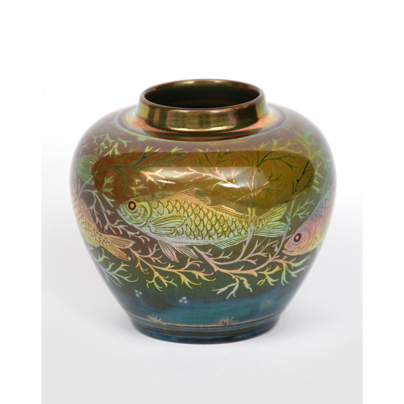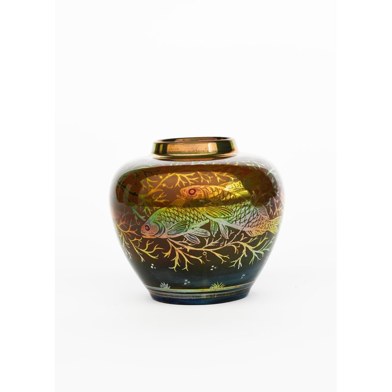 A Pilkington's Lancastrian Pottery vase by Gladys Rogers, shouldered ovoid form, painted with scaly fish swimming amongst waterweed, in golden lustre on a pale blue ground with ruby highlights, impressed factory mark, painted artist cipher, and anchor mark, impressed XI for 1911, 11.5cm. high