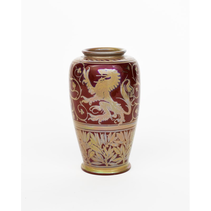 A Pilkington's Lancastrian Pottery vase by William S Mycock, shouldered form with everted top rim, painted with heraldic lion amidst scrolling foliage, above a band of berried laurel in golden lustre on a red ground impressed factory marks, painted artist cipher and date code for 1909, 22cm. high