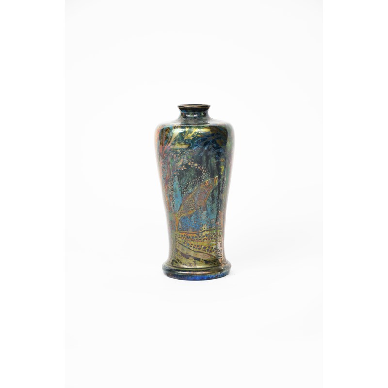 A Pilkington's Lancastrian lustre vase by Richard Joyce, dated 1919, slender, shouldered form painted with scaly fish swimming amongst waterweed, in golden lustre on a streaked blue and green lustre ground, impressed marks, painted artist cipher, 17.5cm. high