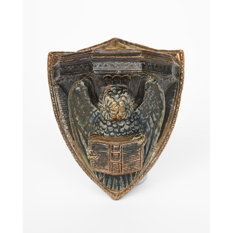 A Martin Brothers stoneware Owl vesta by Robert Wallace Martin, dated 1877, shield shaped with an Owl below corbel, clutching a book in its talons, glazed brown, blue and green, incised 2-1877, 29, R W Martin, professional restoration to front rim, 13.5cm. high