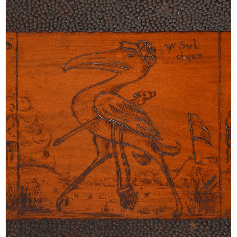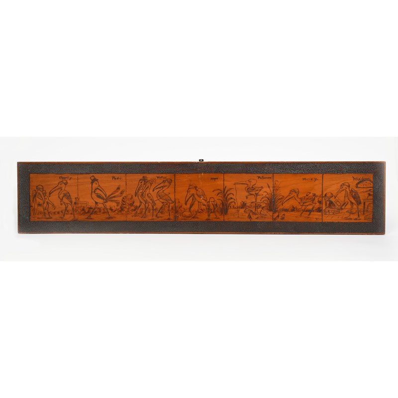 Seven Ages of Man and Seven Virtues a pair of pokerwork panels after the design by Alfred Masson, the rectangular panels decorated with individual scenes of an anthropomorphic bird, unsigned 114 x 22.5cm. (2)