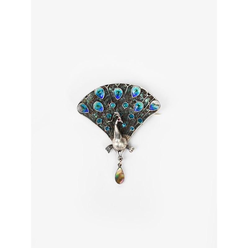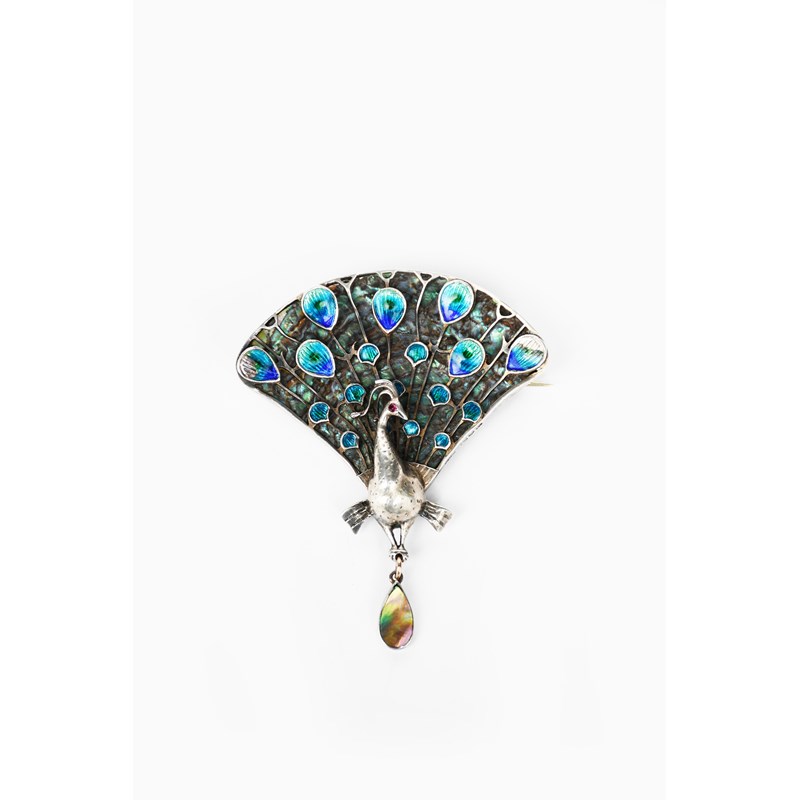 This example is probably number 10, dated 1907, listed by Alan Crawford in C.R Ashbee Architect Designer and Romantic Socialist (page 456 footnote number 55 in a private collection). The Peacock, along with the galleon was one of Ashbee's favourite subjects and he used as the basis for some dozen individual brooches in the early 1900s. he wrote 'I hold the Peacock a most fitting symbol of the Arts and Crafts. It started with a splendid tail, all eyes and pride but that the tail subsequently came off in fireworks. However too the peacock is a symbol of the resurrection'.