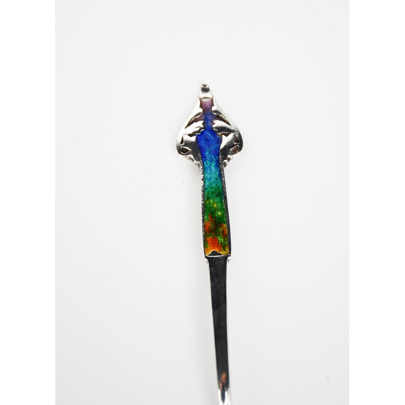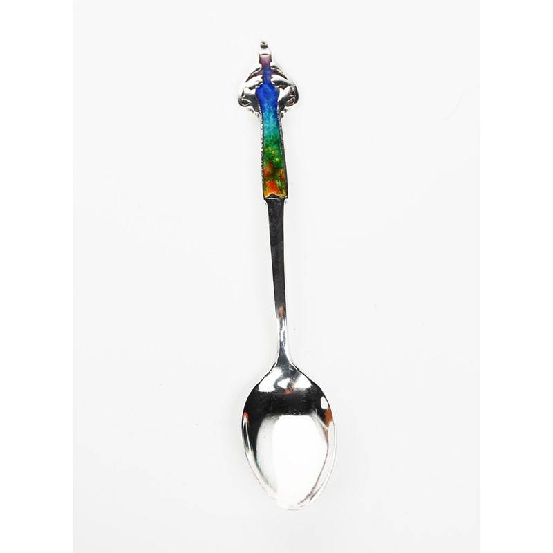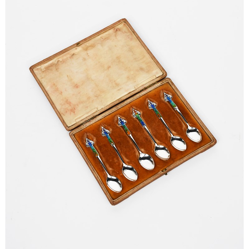 A set of six Liberty silver and enamel teaspoons, cast with Art Nouveau foliate terminal and blue, green and orange enamel panel, in fitted silk lined case, stamped Marks L C & C Ltd, Birmingham 1902, 11cm. long (6)