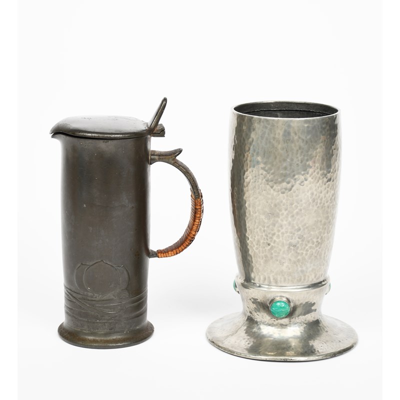A Liberty and Co English Pewter hot-water jug and cover designed by Archibald Knox, model no.0280, cast in low relief with Art Nouveau foliage on whiplash stems, and a Liberty & Co hammered form set with green stone cabochon, stamped marks, 20cm. high