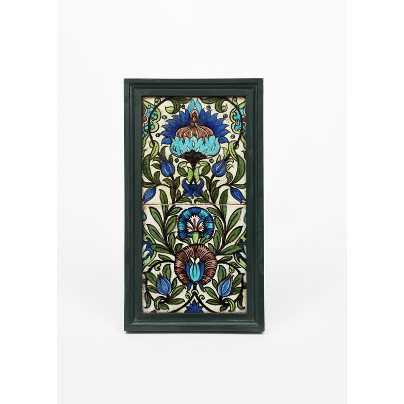 A William De Morgan Merton Abbey Persian two tile panel, painted with flowers and foliage in shades of blue, turquoise, green and aubergine on a white ground, framed , impressed marks, minor glaze loss, 35.5 x 20cm. (frame)