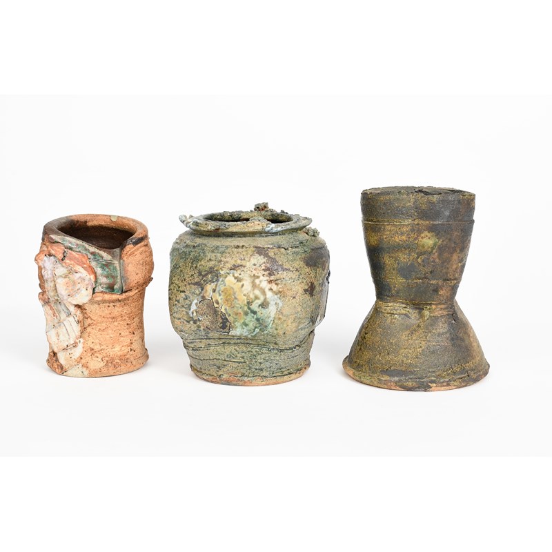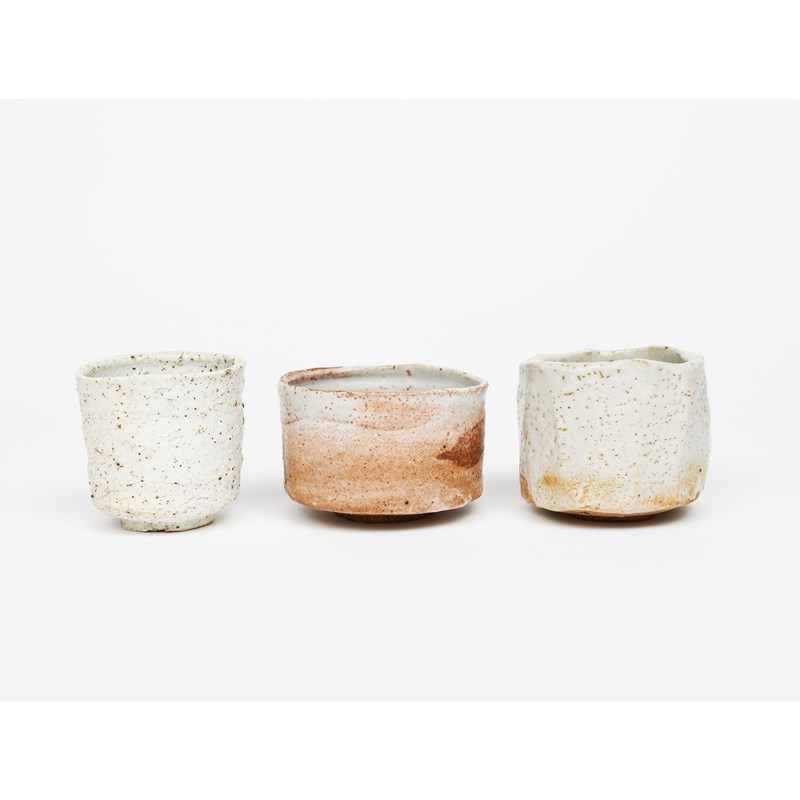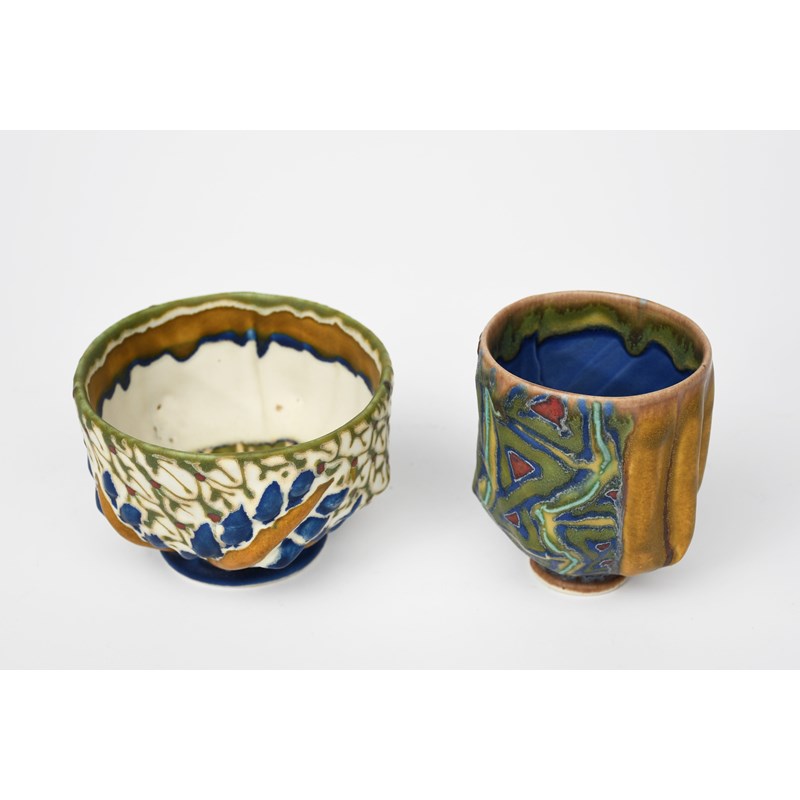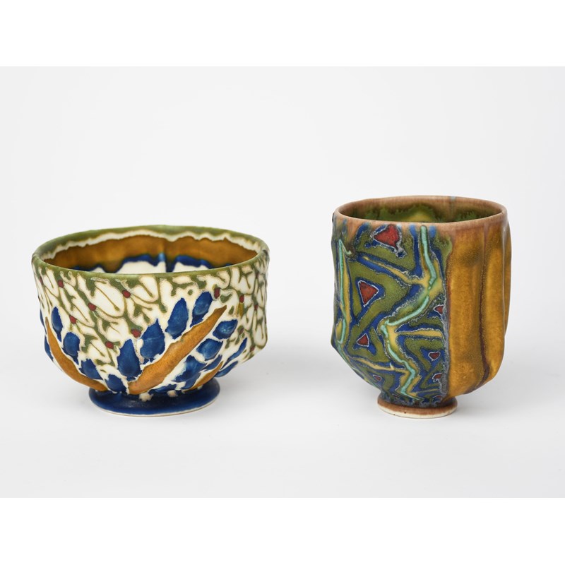 faceted form with painted decoration; and a footed unomi by Bruce Winn, three Chuck Schwartz chawans,