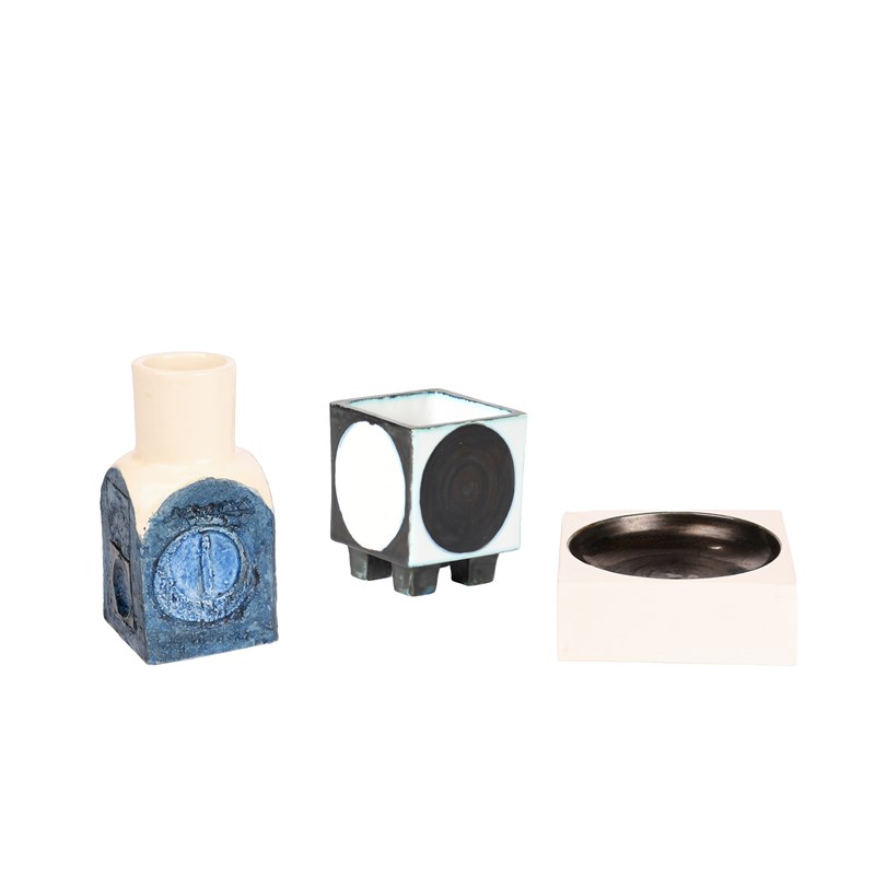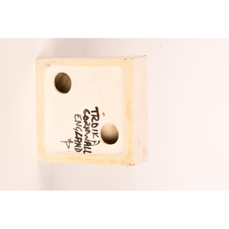 9cm high; a Troika Pottery ashtray glazed bronze and white, and a Troika Pottery chimney, impressed marks, 9cm. high (3).