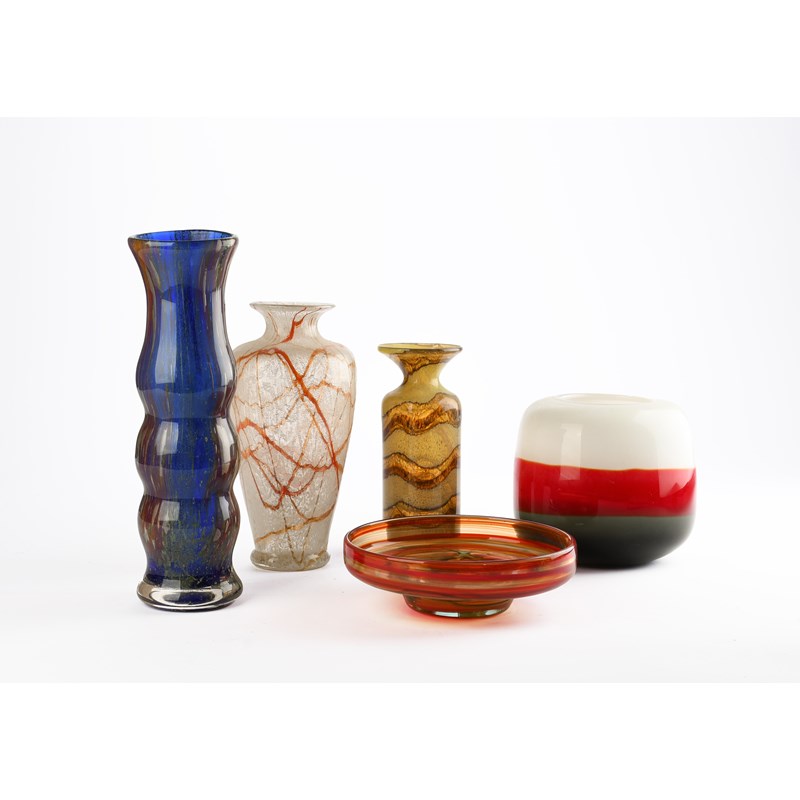 A Mdina glass bowl, a glass vase by Barbara Miszczyk, three glass tubular vases, and a Loetz Scham vase (10).