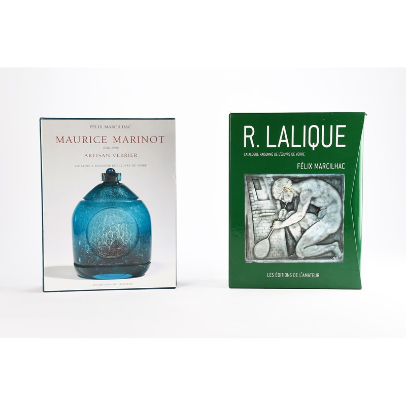 R Lalique Catalogué Raisonné De L'Oeuvre de Verre by Félix Marcilhac, in slip case, published by Les Éditions de L'amateur, and Maurice Marinot (1882-1960) Artisan Verrier Catalogué Raisonné De L'Oeuvre de Verre by Félix Marcilhac, in slip case, (2)