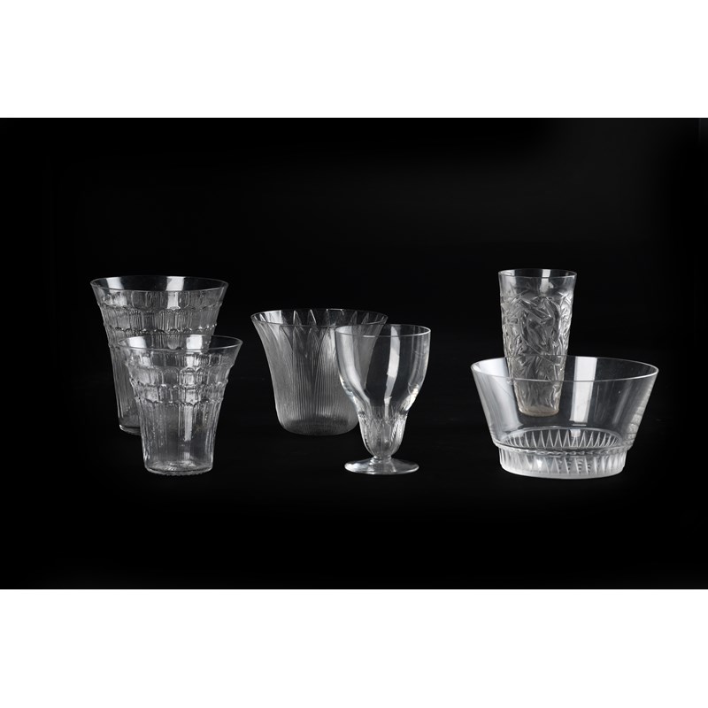 Three glass beakers, a Bourgueil bowl, and a drinking glass
