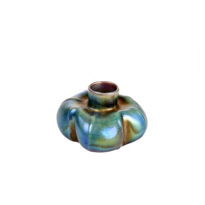 model R.402, compressed, ribbed form, red glass with blue-green iridescent finish