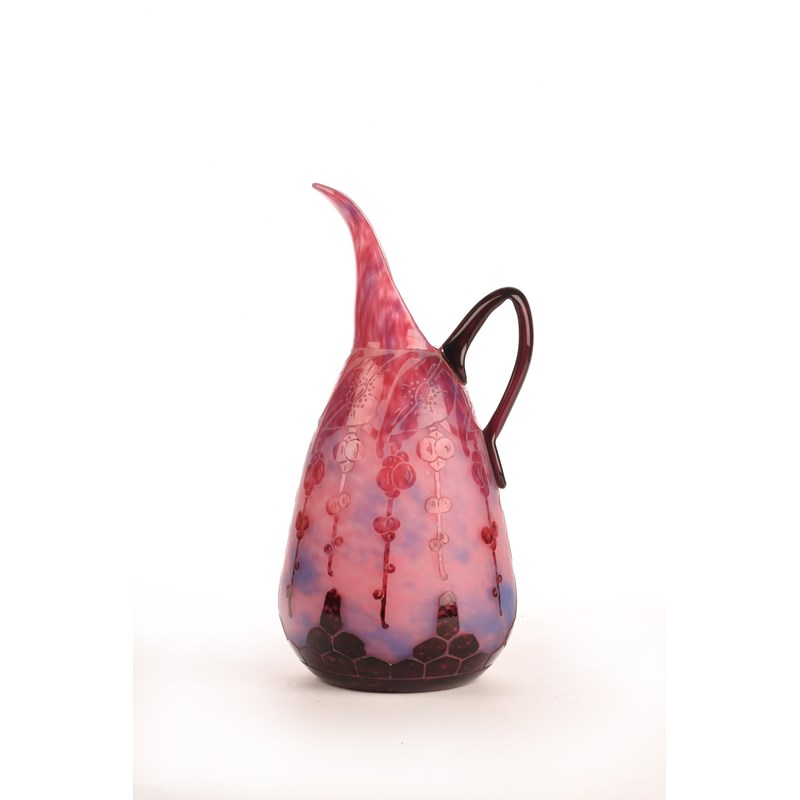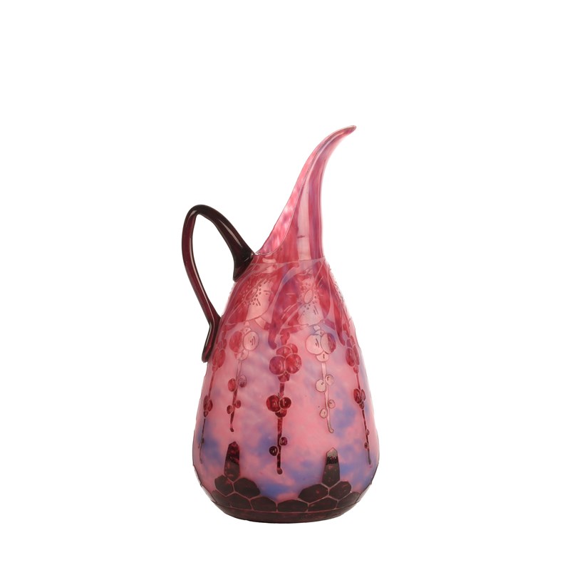 tapering mottled pink and opaque glass body overlaid with pink glass, acid-etched with pendulous stylised flowers, applied glass handle