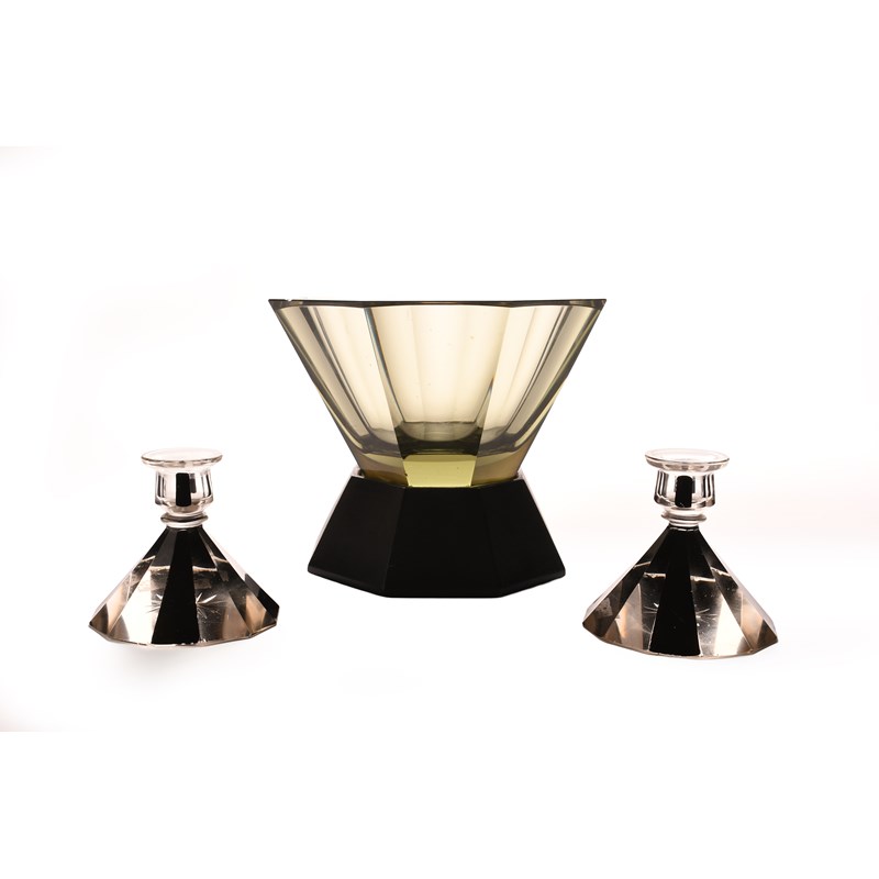 11.5cm high, 23cm wide (the bowl); together with a pair of conical glass candlesticks (4).
