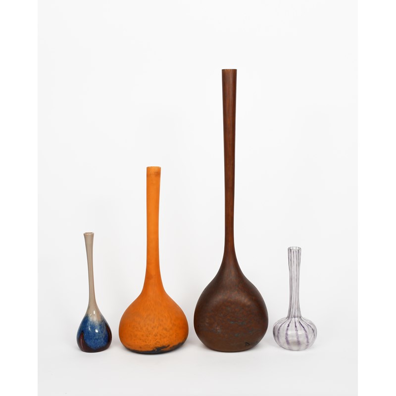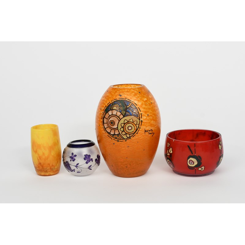 a tall De Latte solifleur glass vase, another De Latte red vase and five other vases painted DeLatte France 18cm. high (8).