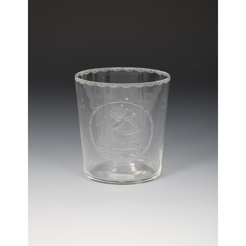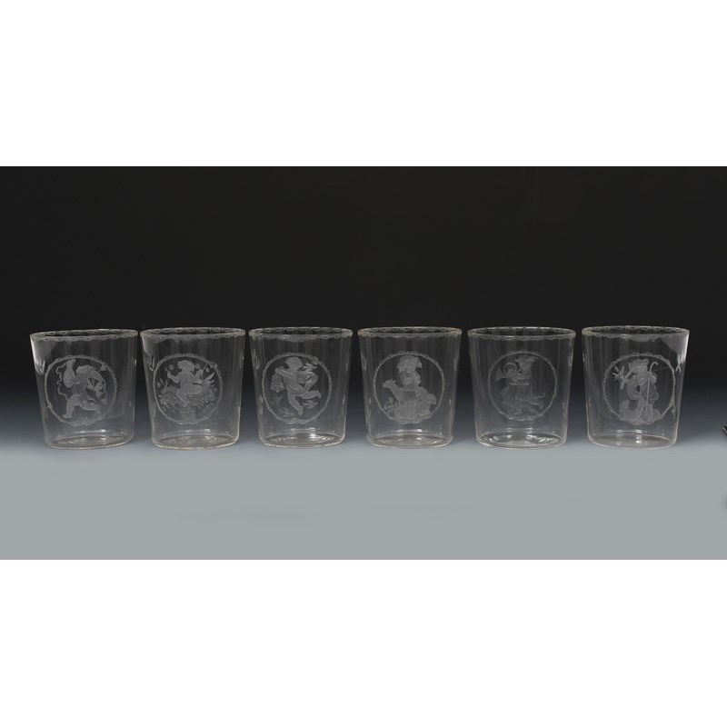 flaring cylindrical form, engraved with a roundel depicting a young child, four playing musical instruments, one sitting in a display of flowers, one with a sheep, the reverse engraved with simple flower stems,