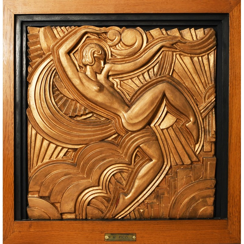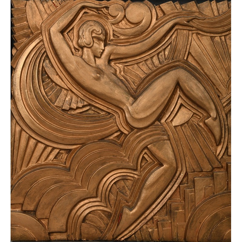 This figural plaque was originally designed as a huge concrete panel for the exterior of the front of the Folies Bergere in Paris by Picaud in 1926. It features the dancer Lila Nikolska.