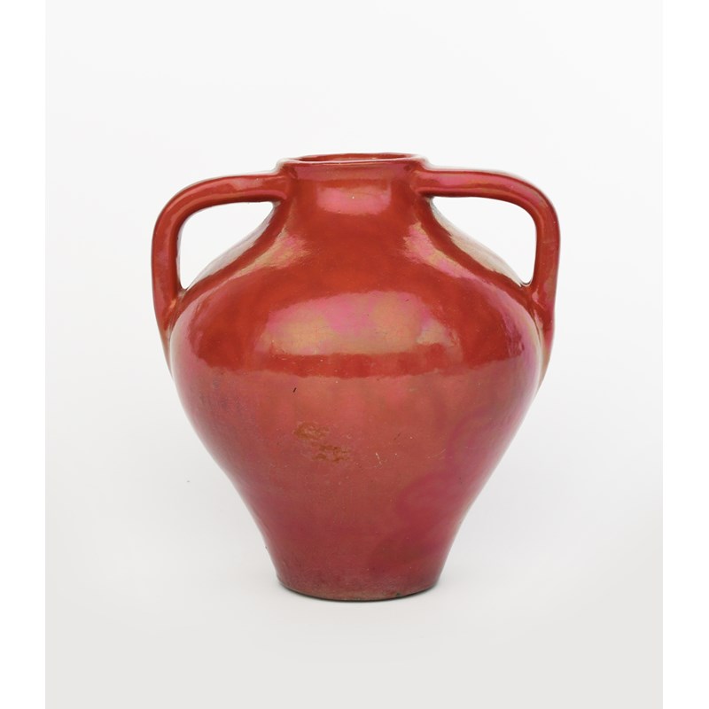 shouldered, swollen form with applied twin-handles, covered in a red lustre glaze