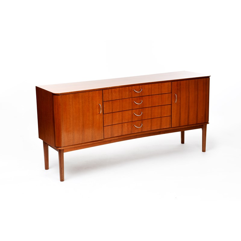 mahogany and Indian Rosewood, the curved front with four drawers flanked by cupboard sections
