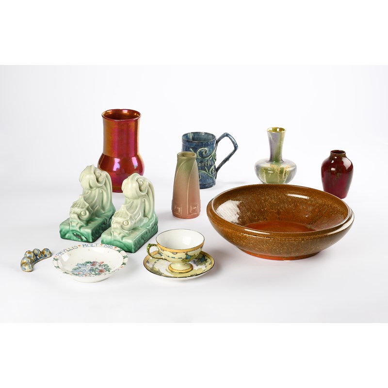 To include a large Royal Lancastrian red glaze bowl, a Pilkington's pair of book ends, modelled as dolphins,