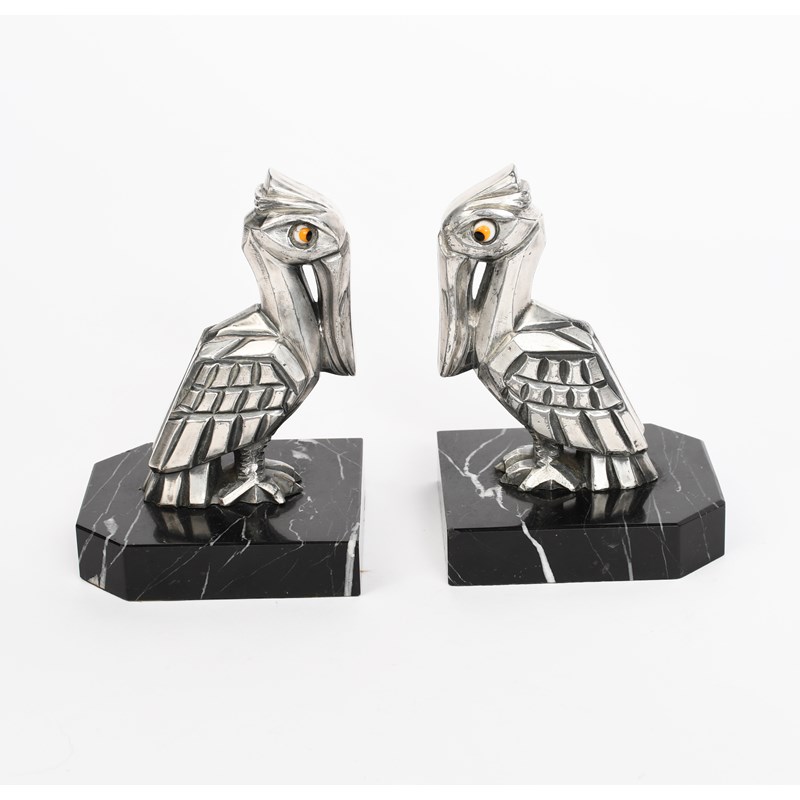A pair of silvered metal bookends, with applied glass eyes and veined black marble bases,