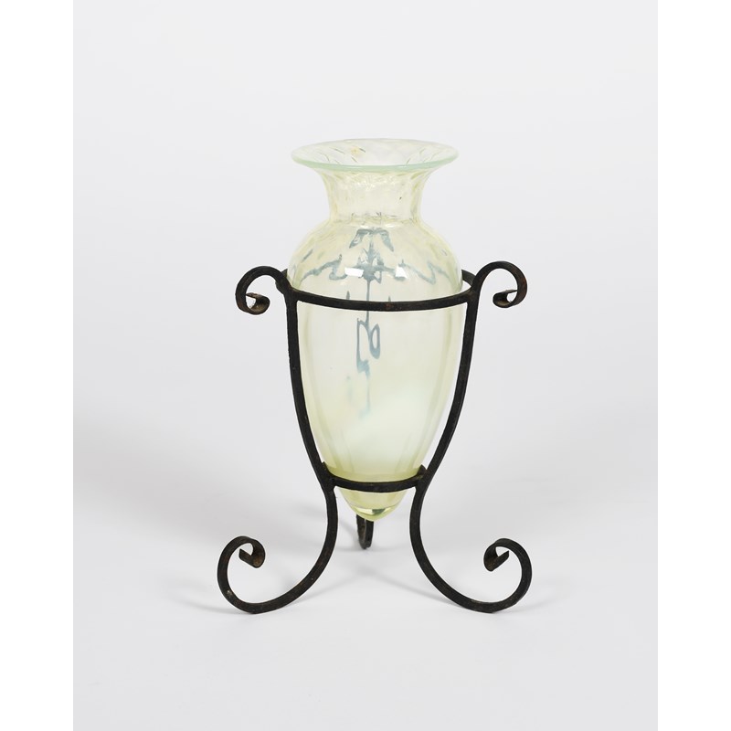 A small James Powell & Sons Whitefrairs glass vase in wrought iron mount designed by Harry Powell, the faceted vaseline glass body set in wrought iron tripod stand unsigned, 18cm. high