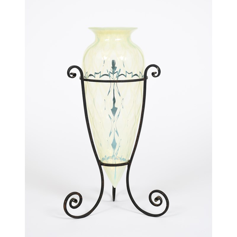 A James Powell & Sons Whitefriars glass vase in wrought iron mount designed by Harry Powell, straw opal glass, in wrought iron mount, unsigned, 41cm. high