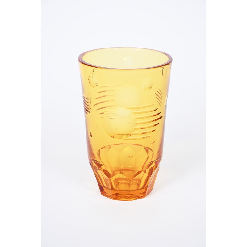 A Whitefriars glass Comet vase designed by William Wilson and Albert Tubby, amber, flaring cylindrical form with cut geometric decoration, unsigned, 21.5cm. high