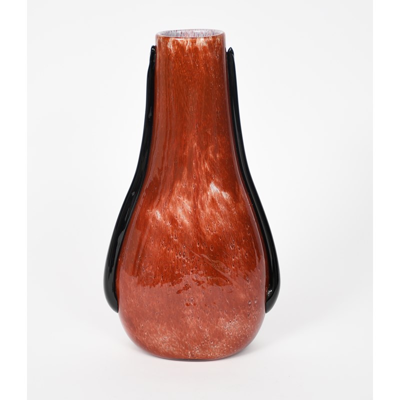 An unusual Gray-Stan glass vase by Elizabeth Graydon-Stannus, flattened pear shaped rust red and white mottled glass cased in clear, with applied black lug handles, etched Gray-Stan mark to base, 36cm. high