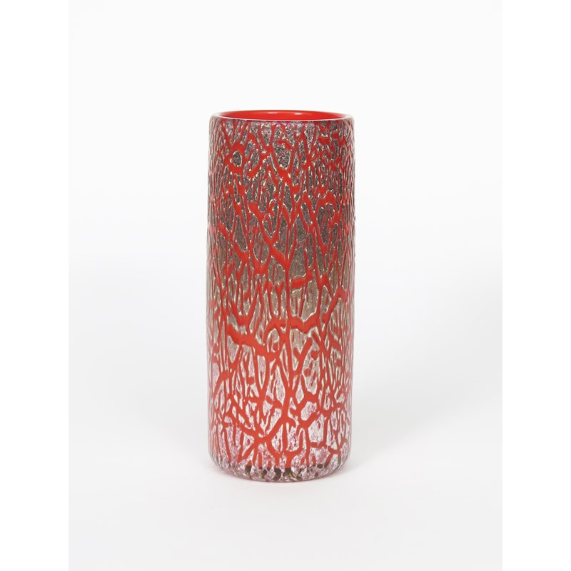 A Moncrieff's Monart Ware Cloisonne vase, shape L, scarlet red liner, surface decorated with lustre, white crackled design, collection label to base, 24.5cm. high