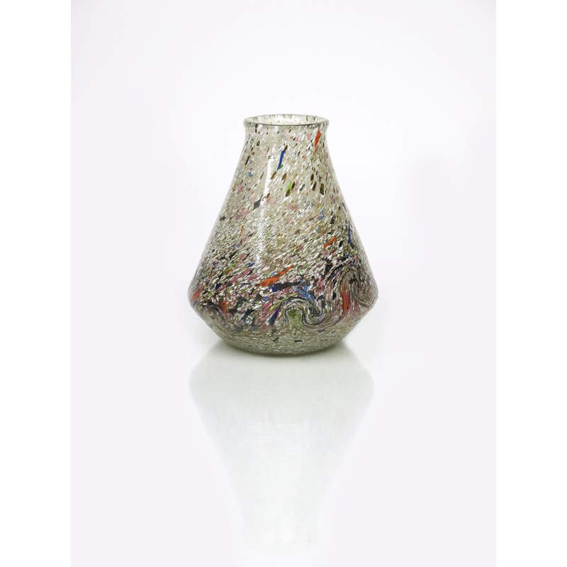 A rare large Moncrieff's Monart Ware surface decorated vase, model AVD31, tapering conical form with everted rim, clear glass body decorated with white splashes, highlighted with pink, blue, orange and yellow whorls towards the base, applied collection paper label, 25cm. high